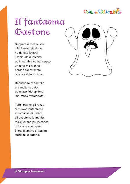 Una poesia per bambini scritta da Giuseppe Pontremoli, da proporre durante il periodo di Hallowen alla scuola primaria e ai bimbi che frequentano la scuola dell’infanzia. Una poesia divertente che narra la disavventura del povero fantasma Gastone che deve togliere il suo lenzuolo di cotone per indossarne uno di lana… Una poesia che proponiamo da leggere online e in una versione illustrata con un disegno da colorare e da stampare gratuitamente. Per stampare la poesia per bambini, scorri la pagina verso il basso e segui le istruzioni!