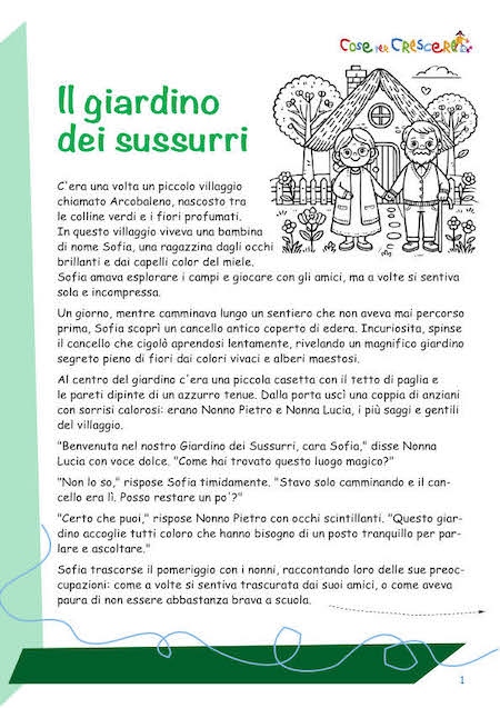 La Festa dei Nonni è un’occasione speciale per celebrare l’amore, la saggezza e l’affetto che i nonni portano nelle nostre vite. Se stai cercando una favola sui nonni da raccontare ai bambini, la storia del “Giardino dei Sussurri” è perfetta. Una storia adatta sia ai bambini della scuola primaria che ai bimbi più piccoli che frequentano la scuola dell’infanzia, che proponiamo da leggere online oltre a una versione illustrata con un disegno da colorare per bambini che puoi stampare gratuitamente scorrendo la pagina verso il basso.