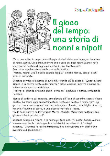 La Festa dei Nonni è un’occasione speciale per celebrare l’amore e la saggezza che i nonni portano nelle nostre vite. Se stai cercando una storia per la Festa dei Nonni da condividere con i tuoi bambini, “Il Gioco del Tempo” è la scelta perfetta. Questa storia affascinante non solo cattura l’immaginazione dei più piccoli, ma insegna loro anche l’importanza dei ricordi e delle tradizioni familiari. La storia sui nonni e i loro giochi è adatta sia ai bambini della scuola primaria sia ai bimbi più piccoli che frequentano la scuola dell’infanzia. La puoi leggere online o stampare gratuitamente la storia illustrata con un disegno da colorare. Basta scorerre la pagina verso il basso e seguire le istruzioni.