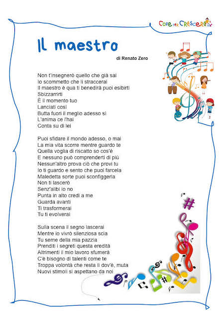 Il maestro è una canzone scritta e interpretata da Renato Zero, un omaggio alla figura del maestro che con la sua guida e la sua saggezza è in grado di aiutare i bambini e i giovani a scoprire il proprio talento e a realizzare i propri sogni. Un bellissimo testo da ascoltare e cantare insieme l’ultimo giorno di scuola, di cui proponiamo il video tratto da Youtube, per ascoltarlo, il testo da leggere online per cantarlo e il testo da stampare gratuitamente per impararlo e cantarlo tutti insieme! Una canzone per salutarci alla fine dell’anno scolastico e un bel pensiero da dedicare alle maestre.