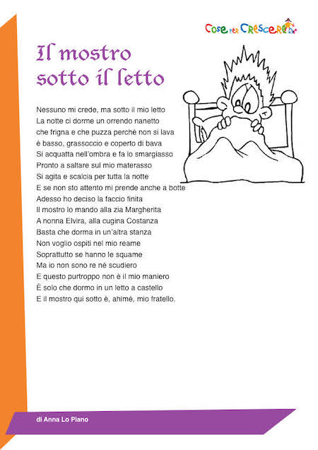 Il mostro sotto il letto è una poesia per bambini adatta sia alla scuola primaria sia ai bimbi più piccoli che frequentano la scuola dell’infanzia. Racconta di un orrendo nanetto puzzolente che terrorizza un bambino durante la notte… una grande paura che finisce però in un grande sorriso! Un testo scritto da Anna Lo Piano, che proponiamo da leggere online e in una versione illustrata con un disegno da colorare e da stampare gratuitamente. Per stampare la poesia per bambini, scorri la pagina verso il basso e segui le istruzioni!
