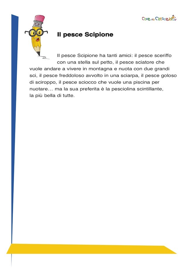 Il pesce Scipione ha tanti amici: il pesce sceriffo con una stella sul petto, il pesce sciatore che vuole andare a vivere in montagna e nuota con due grandi sci, il pesce freddoloso avvolto in una sciarpa, il pesce goloso di sciroppo, il pesce sciocco che vuole una piscina per nuotare… ma la sua preferita è la pesciolina scintillante, la più bella di tutte.