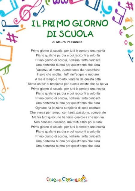 Una canzone sul primo giorno di scuola, scritta da Mauro Passarella e adatta ai bambini che iniziano l’anno scolastico della scuola primaria o della scuola dell’infanzia. Una canzone per accogliere i bambini in allegria di cui proponiamo sia il testo (anche in versione da stampare) che il video per poterla ascoltare e imparare più facilmente.