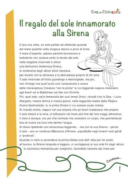 Una storia sul mare per bambini, da leggere insieme o da raccontare, che proponiamo sia da leggere online che in una versione da stampare e illustrata con un disegno da colorare. Il regalo del sole innamorato alla Sirena ci racconta di quella volta in cui il sole salvò la vita della sirena tanto amata.