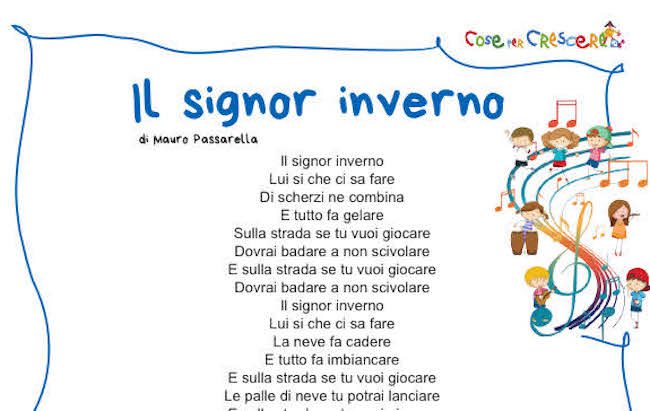 Il signor Inverno è un brano di Mauro Passarella, tratto dall’album “Canzoni di stagione” del 2012. Una canzone adatta ai bambini della scuola primaria e della scuola dell’infanzia. Puoi ascoltare la canzone grazie al video, leggere il testo online per cantarla o stamparlo, scorrendo la pagina verso il basso e seguendo le istruzioni.