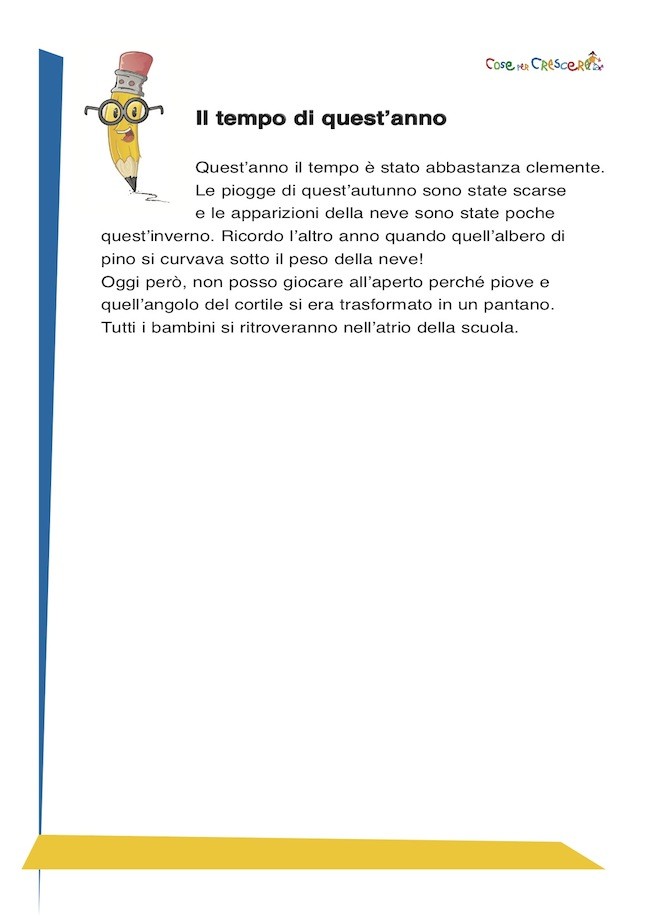 Oggi però, non posso giocare all’aperto perché piove e quell’angolo del cortile si era trasformato in un pantano. Tutti i bambini si ritroveranno nell’atrio della scuola.