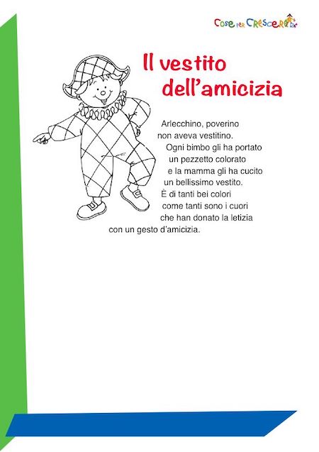 Il vestito dell’amicizia è una piccola poesia di Carnevale per bambini, una filastrocca adatta ai bambini della scuola primaria e della scuola dell’infanzia. Una poesia su Arlecchino e sulla nascita del suo vestito così colorato, bello e particolare che proponiamo sia da leggere online che in una versione impaginata e illustrata con un disegno da colorare, da stampare gratuitamente. Per stampare la poesia basta scorrere la pagina verso il basso e cliccare sull’immagine dove segnato: si aprirà una seconda finestra con la poesia di Carnevale per bambini in formato pdf, pronta per essere scaricata e/o direttamente stampata.