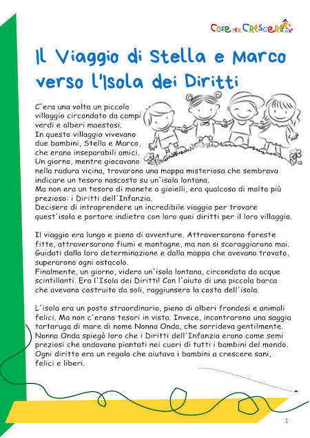 E così, la storia di Stella e Marco e del loro viaggio verso l’Isola dei Diritti venne tramandata di generazione in generazione, ricordando a tutti che i diritti dell’infanzia sono i tesori più preziosi di tutti, e che devono essere coltivati e protetti con amore.