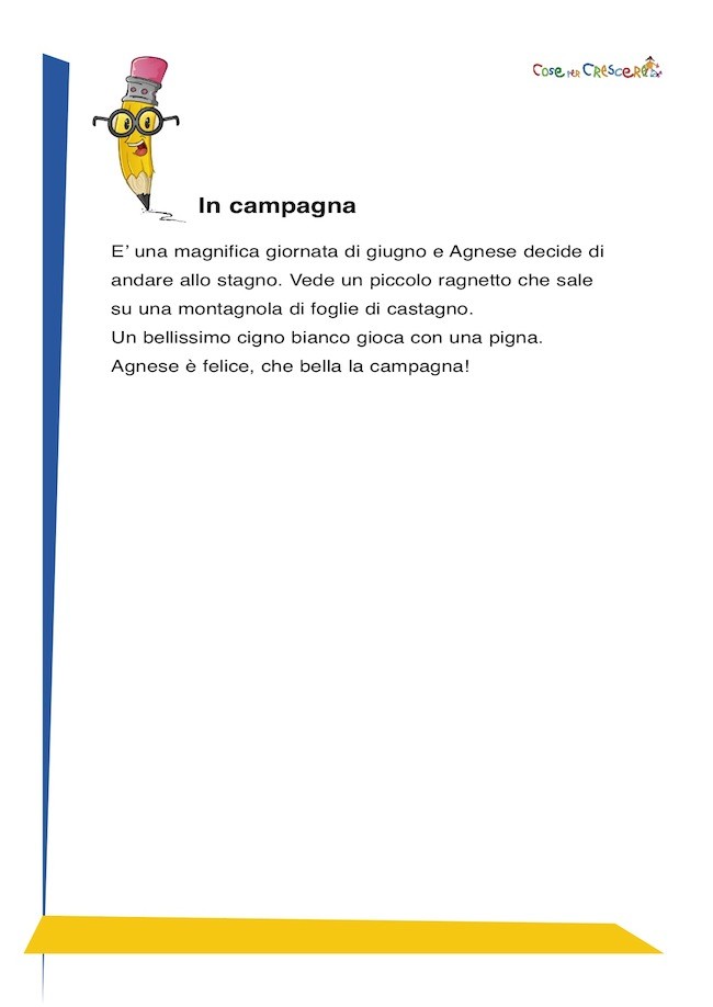 E’ una magnifica giornata di giugno e Agnese decide di andare allo stagno. Vede un piccolo ragnetto che sale su una montagnola di foglie di castagno. Un bellissimo cigno bianco gioca con una pigna. Agnese è felice, che bella la campagna!