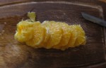 Tagliate le arance a fette rotonde e sottili. Tagliate ogni fetta in due e sistematele in un piatto di portata.