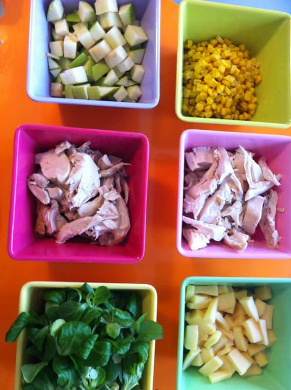 Ogni persona (ed ogni bambino) deve servirsi liberamente e comporre la propria insalata. Questo serve sia al bambino per capire che si può associare il dolce (la frutta) con il salato sia a noi mamme per capire cosa piace ai nostri figli! Guardate quello che avete nel frigo e sostituite, per esempio, il pollo con tonno, salmone, gamberi o altro. Scoprirete e farete scoprire ai vostri bambini, nuovi abbinamenti di sapori. Provate a proporre una ciotola di pompelmo rosa!