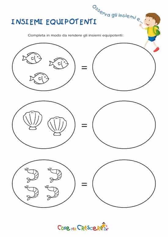 Questa idea aiuta i bambini a comprendere che quello che conta, per riconoscere due insiemi equipotenti, è la quantità di elementi, non il tipo.