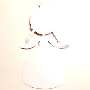 - Ritagliare la sagoma. Con una penna o un pennarello a punta fine, scrivere l’invito sulla gonna della sagoma.