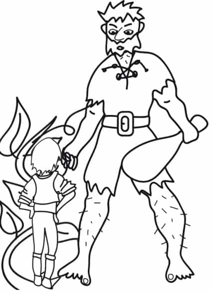 Jack e il gigante : disegno da colorare Disegno di Jack davanti al gigante che abita nel castello che il ragazzo trova in cima alla sua pianta di fagioli. Vi ricordate cosa sente dire dal gigante? “Ucci, ucci, sento odor di cristianucci!” Cliccare sul disegno per stamparlo: