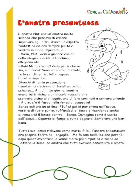 Tutti i suoi amici ridevano come matti; E lei, l’anatra presuntuosa, era proprio ferita nell’orgoglio… Ma questa fu una lezione perché, dopo quest’avventura, divenne molto più simpatica e tornò ad essere la semplice anatra che tutti avevano conosciuto e amato.