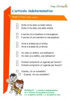L’ articolo indeterminativo Un esercizio da stampare per i bambini di terza e quarta della scuola primaria: l’articolo indeterminativo. I bambini dovranno individuare l’articolo corretto, adatto ad ogni frase. Vedi anche>>> L’articolo determinativo: esercizio COME FARE L'ESERCIZIO Cliccare sulla scheda L’articolo indeterminativo e stamparla: Leggere la consegna con il bambino e assicurarsi che abbia capito. Alla fine dell’esercizio, rileggere le parole con il bambino e correggere insieme gli eventuali errori. Ricompensare il bambino con un bel diploma. Soluzione (cliccare sull’immagine per ingrandirla):