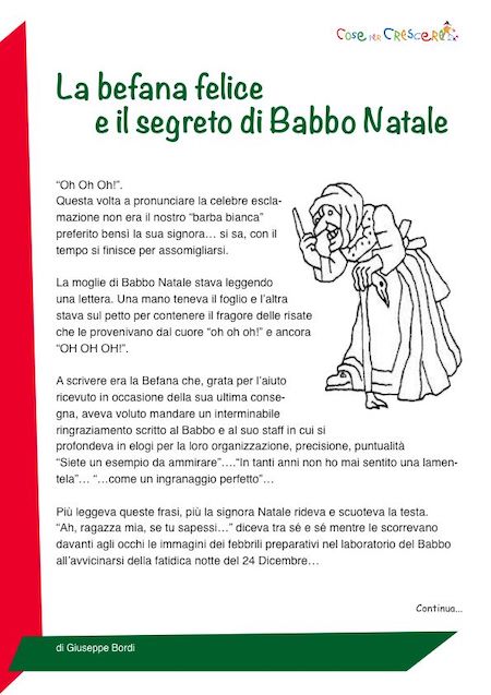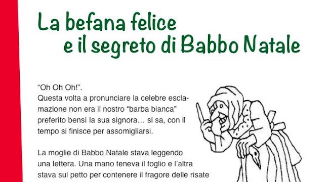 Cosa può essere questo grande segreto di Babbo Natale? Possiamo capirlo leggendo la storia La Befana felice e il segreto di Babbo Natale, una bella storia per bambini che ho trovato gironzolando per il web, scritta da Patrizia Pagnutti. Una storia sulla Befana per bambini che proponiamo da leggere online o in una versione illustrata con un disegno da colorare e da stampare gratuitamente (scorri la pagina verso il basso e segui le istruzioni).