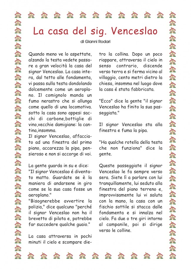 Queste passeggiate il signor Venceslao le fa sempre verso sera. Siete lì a parlare con lui tranquillamente, lui seduto alla finestra del piano terreno e, improvvisamente lui vi saluta con la mano, la casa con un fischio sottile si stacca dalle fondamenta e si innalza nel cielo. Fa due o tre giri intorno al campanile, poi si dirige verso le colline.