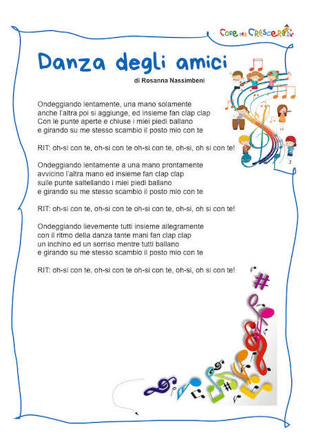 La canzone “Danza degli amici” è un’allegra e coinvolgente melodia scritta appositamente per l’accoglienza dei bambini nel loro primo giorno di scuola. Una canzone per bambini scritta da Rosanna Nassimbeni (testo e musica).