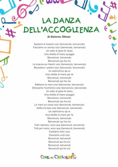 Per facilitare l’uso in classe o a casa, abbiamo preparato il testo della canzone “La danza dell’accoglienza” in versione stampabile. È sufficiente cliccare sul pulsante qui sotto per aprire il PDF pronto per essere scaricato e stampato o scorrere la pagina verso il basso e cliccare sull’immagine del testo da stampare.