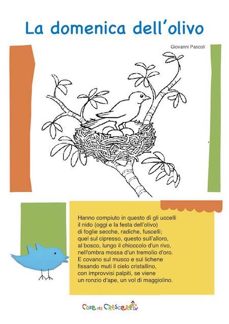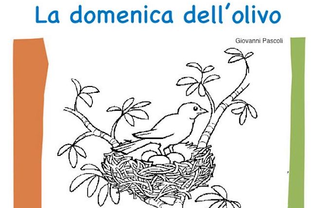 Una famosa poesia di Giovanni Pascoli sulla Pasqua, La domenica dell’olivo. Una poesia che l’autore scrive prendendo spunto da un proverbio: la domenica dell’ulivo, ogni uccello fa il suo nido. Una poesia adatta ai bambini che frequentano la scuola primaria, che proponiamo sia da leggere online sia in una versione illustrata con un disegno per bambini da colorare e da stampare gratuitamente. Per stampare la poesia, scorri la pagina verso il basso e clicca sull’immagine dove segnato: si aprirà una seconda schermata con la poesia di Pasqua per bambini in formato pdf e pronta per essere scaricata e/o direttamente stampata con una normale stampante.
