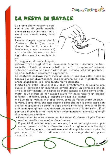 La contessa passava molti mesi all’anno in una sua villa: e non lo faceva già per divertimento, ma per amore de’ suoi figlioletti, che erano gracilissimi e di una salute molto delicata. Finita l’ora della lezione, il più gran divertimento di Luigino era quello di cavalcare un magnifico cavallo sauro; un animale pieno di vita e di sentimento, che sarebbe stato capace di fare cento chilometri in un giorno se non avesse avuto fin dalla nascita un piccolo difetto: il difetto, cioè, di essere un cavallo di legno! Ma Luigino gli voleva lo stesso bene, come se fosse stato un cavallo vero. Basta dire, che non passava sera che non lo strigliasse con una bella spazzola da panni: e dopo averlo strigliato, invece di fieno o di gramigna, gli metteva davanti una manciata di lupini salati. E se per caso il cavallo si ostinava a non voler mangiare, allora Luigino gli diceva accarezzandolo: «Vedo bene che questa sera non hai fame. Pazienza: i lupini li mangerò io. Addio a domani, e dormi bene».