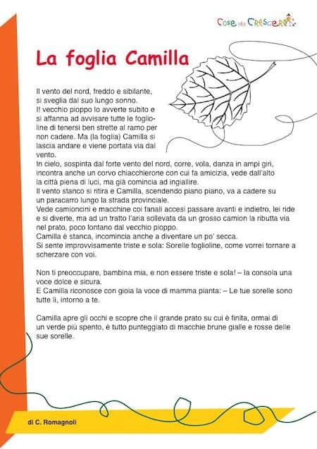 La foglia Camilla è una storia sull’autunno per bambini, scritta da C. Romagnoli che racconta di Camilla, la foglia di un pioppo che arrivato l’autunno e non resistendo al vento, si staccò dall’albero dove viveva felice con tutte le sue sorelle… cosa le succederà?