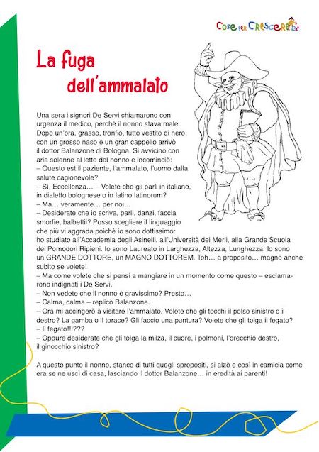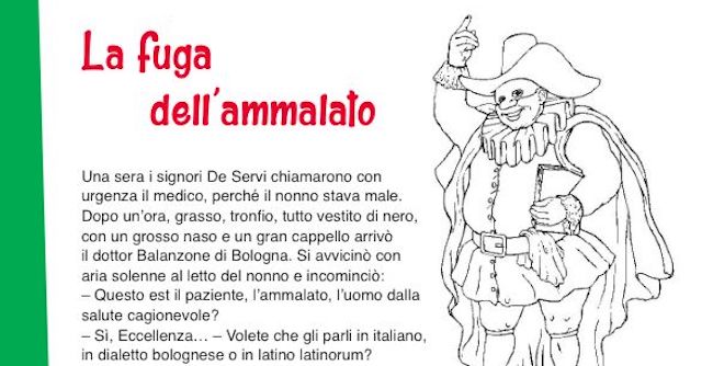 Una sera i signori De Servi chiamarono con urgenza il medico, perché il nonno stava male. Dopo un’ora, grasso, tronfio, tutto vestito di nero, con un grosso naso e un gran cappello arrivò il dottor Balanzone di Bologna. Si avvicinò con aria solenne al letto del nonno e incominciò: