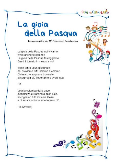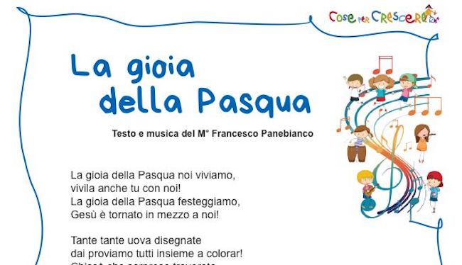 La gioia della Pasqua è una canzone per bambini scritta dal Maestro Francesco Panebianco. Una canzone sulla Pasqua per i bambini della scuola primaria e della scuola dell’infanzia facile da imparare di cui proponiamo il video per ascoltarla e il testo sia da leggere online sia da stampare per impararla e cantarla insieme! Per stampare il testo, scorri la pagina verso il basso e clicca sull’immagine dove segnato: si aprirà una seconda finestra con il testo della canzone per bambini in formato pdf da scaricare e/o da stampare direttamente con una normale stampante.