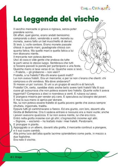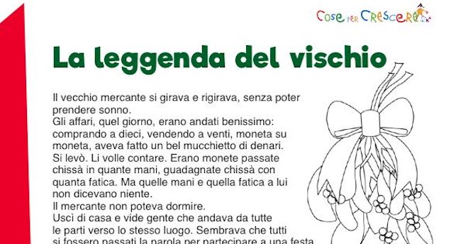 La leggenda del vischio di Natale, è una bel racconto per bambini scritta da I. Drago che narra di come nacque il vischio e di un vecchio mercante, avaro e disonesto che una notte di dicembre, si trovò improvvisamente in mezzo a tante persone che lo chiamavano fratello… Una storia per bambini che proponiamo sia da leggere online sia in una versione illustrata con un disegno da colorare e da stampare gratuitamente. Per stampare la storia di Natale, scorri la pagina verso il basso e clicca sull’immagine dove segnato: si aprirà una seconda finestra con la storia in formato pdf da scaricare e/o da stampare direttamente.