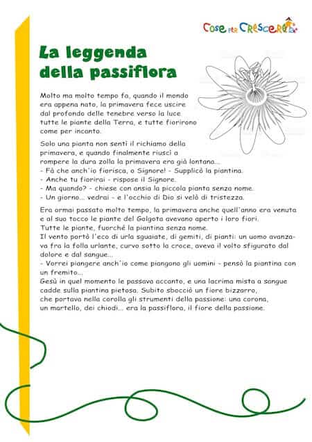 Gesù in quel momento le passava accanto, e una lacrima mista a sangue cadde sulla piantina pietosa. Subito sbocciò un fiore bizzarro, che portava nella corolla gli strumenti della passione: una corona, un martello, dei chiodi… era la passiflora, il fiore della passione.