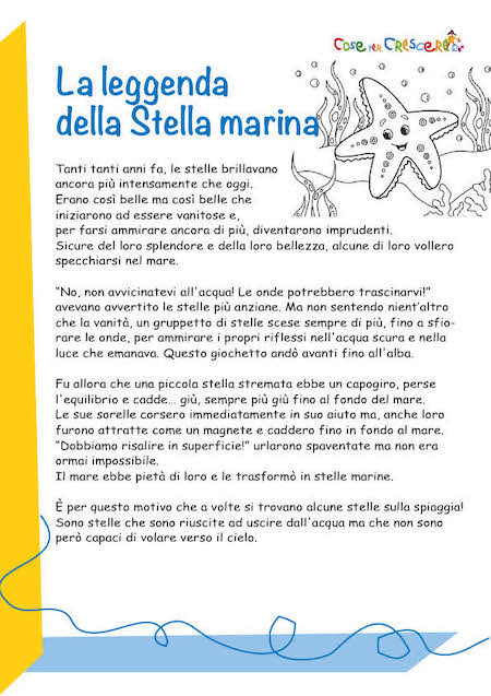 Perché ci sono delle stelle nel mare? Ce lo racconta questa bella favola, la leggenda della Stella marina, una storia per bambini da raccontare o da leggere insieme. Come per tutte le storie che pubblichiamo, proponiamo sia la versione da leggere online sia una versione da stampare gratuitamente, illustrata con un disegno da colorare. Per stampare la storia, scorri la pagina verso il basso e segui le istruzioni: si aprirà una seconda finestra con la storia per bambini in versione pdf pronta per essere stampata e/o scaricata.