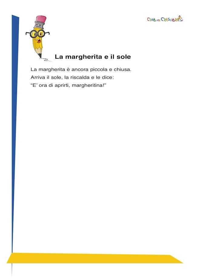 La margherita è ancora piccola e chiusa. Arriva il sole, la riscalda e le dice: “E’ ora di aprirti, margheritina!”