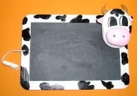 Abbiamo utilizzato una semplice lavagna di legno che abbiamo dipinto e sulla quale abbiamo poi incollato una testa di mucca fatta in pasta di sale ma che può essere realizzata con qualsiasi pasta da modellare.