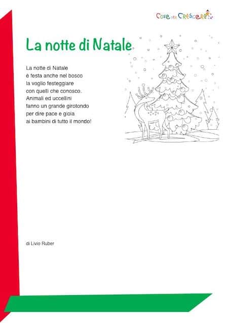 Una breve poesia di Natale, adatta ai bambini che frequentano la scuola primaria e a quelli più piccoli della scuola dell’infanzia. La notte di Natale ci porta nella magia del bosco dove animali ed uccellini festeggiano Natale. Proponiamo questa poesia per bambini sia da leggere online sia in una versione da stampare gratuitamente e illustrata con un disegno da colorare. Per stampare la poesia di Natale, scorri la pagina verso il basso e clicca sull’immagine dove segnato: si aprirà una seconda finestra con la poesia in formato pdf, pronta per essere scaricata e/o direttamente stampata.