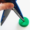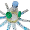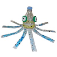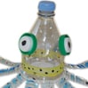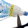 - Sempre con la punta delle forbici, fare due buchi nella bottiglia, all’altezza alla quale andranno sistemati gli occhi. Fissare i 2 tapponi con i ferma campioni.