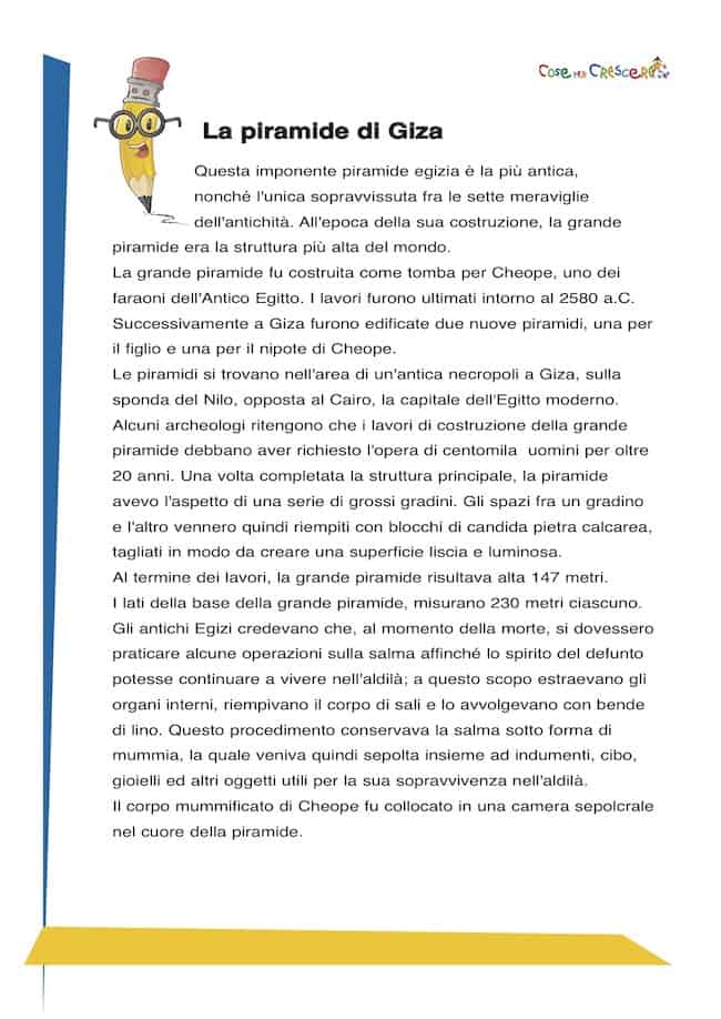 La grande piramide fu costruita come tomba per Cheope, uno dei faraoni dell’Antico Egitto. I lavori furono ultimati intorno al 2580 a.C. Successivamente a Giza furono edificate due nuove piramidi, una per il figlio e una per il nipote di Cheope.