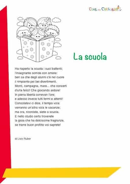 Una poesia per bambini, per il rientro o l’inizio della scuola. La scuola è una poesia per bambini scritta da Livio Ruber, adatta alle classi della scuola primaria, che proponiamo sia da leggere online sia in una versione illustrata con un disegno da colorare e da stampare gratuitamente.