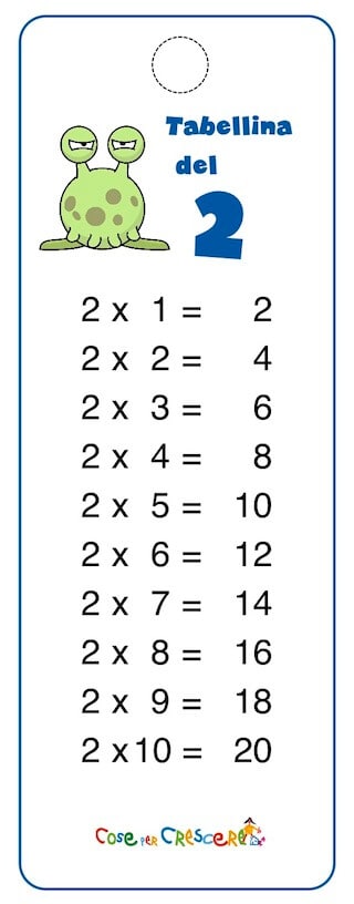 La tabellina del 2, da stampare, ritagliare e imparare. La tabellina del 2 è l’elenco dei risultati della moltiplicazione per 2 dei numeri da 1 a 10. La tabellina del due compare all’interno della tavola pitagorica nella seconda riga e nella seconda colonna. Come per le altre tabelline, puoi stamparla e ritagliarla, in modo da averla sempre a portata di mano. Ritaglia anche il buco segnato in alto, infila un nastro colorato (che chiuderai con un nodo) e unisci tutte le tabelline!