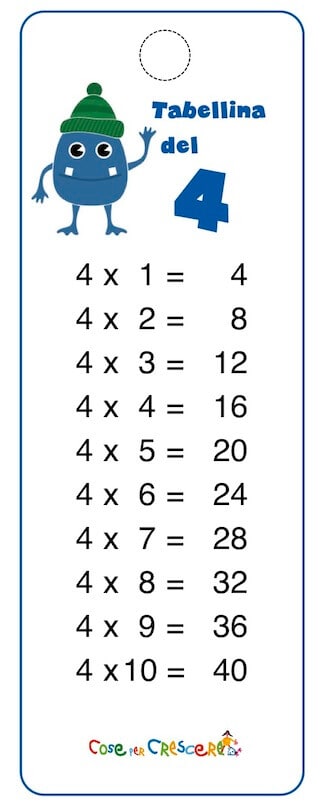 Come per le altre tabelline, puoi stamparla e ritagliarla, in modo da averla sempre a portata di mano. Ritaglia anche il buco segnato in alto, infila un nastro colorato (che chiuderai con un nodo) e unisci tutte le tabelline!