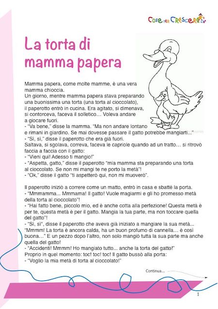 La torta di mamma papera è una storia per bambini che narra della complicità tra mamma e figlio, e di come quello che poteva essere un grande pericolo si trasformò in una grande risata e una gustosa merenda. Una storia da dedicare alla mamma, che proponiamo sia da leggere online che da stampare in una versione illustrata con un disegno per bambini da colorare. Per stampare la storia, scorri la pagina verso il basso e clicca dove segnato: si aprirà una seconda finestra con la favola in formato pdf, pronta per essere scaricata e/o direttamente stampata con una normale stampante.