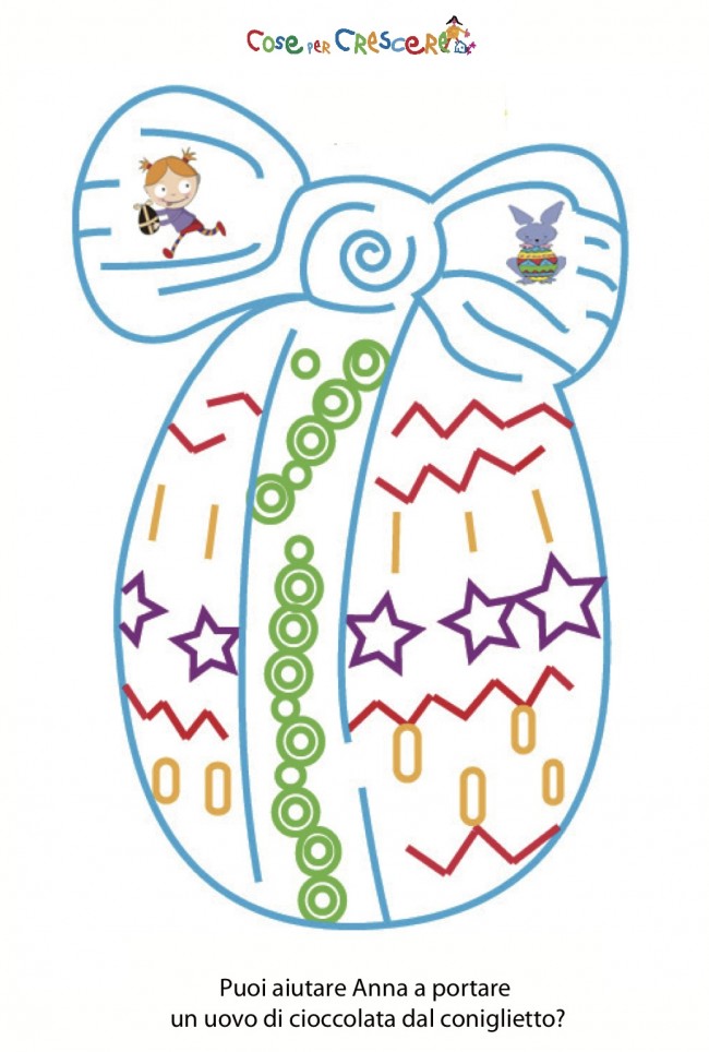 Labirinto di Pasqua Un gioco del labirinto da stampare e da proporre ai bambini durante i giorni di Pasqua. Anna vuole regalare un bellissimo uovo di cioccolato al suo amico coniglietto ma la strada è complicatissima! Dovrà attraversare un gigantesco uovo di Pasqua… GIOCO DA STAMPARE Cliccare sul labirinto per stamparlo: Vuoi vedere la soluzione? Clicca qui!