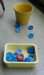 • Ogni bambino, uno alla volta, dovrà lanciare i propri tappi, cercando di mandarne il più possibile nel recipiente.