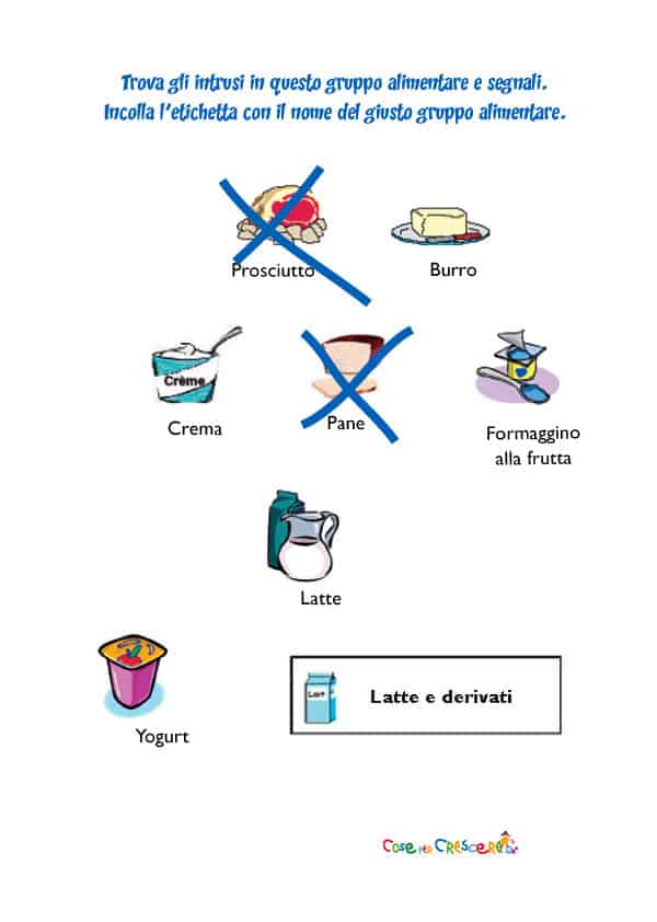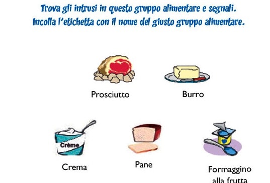 • Chiedete al bambino di ritagliare le etichette dei gruppi alimentari, scegliere quella corretta e incollarla sulla scheda.