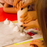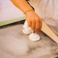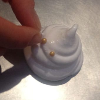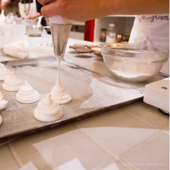 - Trasferite il composto in un sac à poche con il bocchettone liscio rotondo da 2 cm di diametro e, sulla teglia formate 30 meringhe a forma di fantasmino.