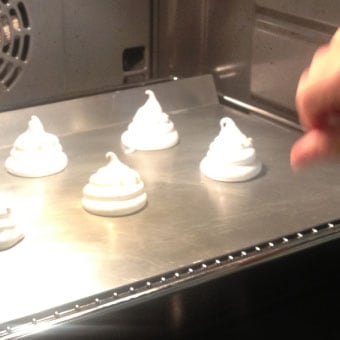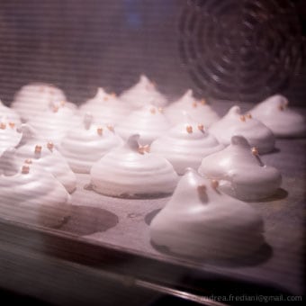 - Cuocete le meringhe nel forno già caldo a 120° per 25 minuti, poi spegnetelo e lasciatele riposare nel forno spento per almeno 30 minuti o fino a quando saranno ben asciutte.