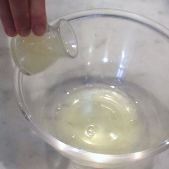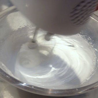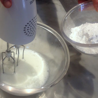 - Mettete gli albumi a temperatura ambiente in una ciotola con qualche goccia di succo di limone e montateli con le fruste elettriche. Continuando a montare unite poco a poco lo zucchero a velo.