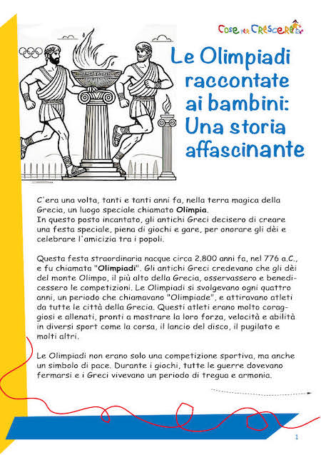 Le Olimpiadi sono uno degli eventi sportivi più importanti e celebrati al mondo, ma come spiegare ai più piccoli la loro origine e il loro significato? Ecco quindi la storia delle Olimpiadi da leggere con loro o da raccontare. Le Olimpiadi raccontate ai bambini, da leggere online e/o da stampare gratuitamente in una versione illustrata con un disegno da colorare per bambini. Un modo semplice e coinvolgente per far conoscere ai bambini questa storica competizione.