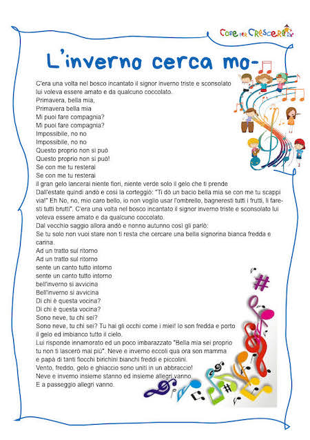 Dall’estate quindi andò e così la corteggiò: “Ti dò un bacio bella mia se con me tu scappi via!” Eh No, no, mio caro bello, io non voglio usar l’ombrello, bagneresti tutti i frutti, li faresti tutti brutti”. C’era una volta nel bosco incantato il signor inverno triste e sconsolato lui voleva essere amato e da qualcuno coccolato.