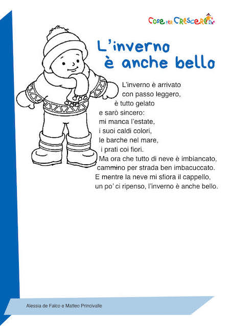 È arrivato l’inverno, e con lui il freddo, la neve e l’atmosfera magica che tutto imbianca! Però, l’inverno non è solo giornate corte e temperature gelide. In questa dolce poesia intitolata “L’inverno è anche bello”, scritta da Alessia De Falco e Mattia Princivalle, scopriamo come anche il fascino particolare di questa stagione. Una poesia per bambini che proponiamo da leggere online e da scaricare e stampare gratuitamente in una versione illustrata con un disegno da colorare. Per stampare la poesia, scorri la pagina verso il basso e clicca sull’immagine dove segnato.